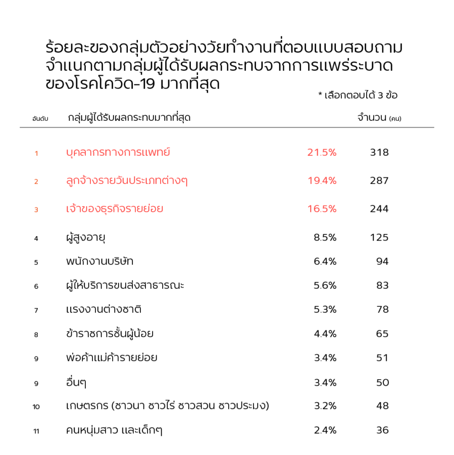 คำถามหัวข้อ ‘กลุ่มผู้ได้รับผลกระทบจากการแพร่ระบาดของโรคโควิด-19 มากที่สุด’ พบว่า อันดับ 1 คือ บุคลากรทางการแพทย์ (ผู้ตอบจำนวน 318 คน หรือร้อยละ 21.5) อันดับ 2 กลุ่มลูกจ้างรายวันประเภทต่างๆ (ผู้ตอบจำนวน 287 คน หรือร้อยละ 19.4) อันดับที่ 3 กลุ่มเจ้าของธุรกิจรายย่อย (ผู้ตอบจำนวน 244 คน หรือร้อยละ 16.5) ทั้งสามกลุ่มนี้ต่างเป็นกลุ่มอาชีพที่ได้รับผลกระทบโดยตรงจากมาตรการของภาครัฐแทบทั้งสิ้น เช่น การจัดสรรบุคลากรทางการแพทย์ การประกาศเคอร์ฟิว หรือการประกาศห้ามดำเนินงานบางกิจการ (ตอบได้มากกว่า 1 ข้อ)
