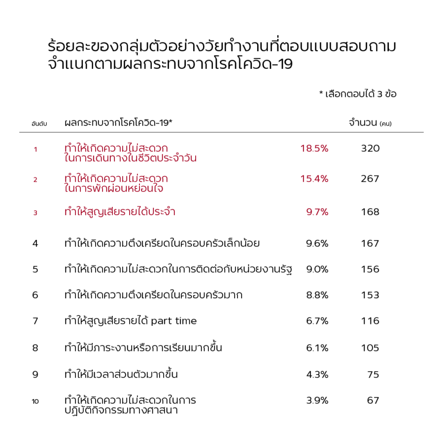 คำถามถึงทุกข์สุขที่สำคัญคำถามหนึ่งของโครงการวิจัย โควิด-19 กับสังคมไทยฯ คือ อะไรเป็นผลกระทบสำคัญจากโควิด-19 ซึ่งนำมาสู่ความยากลำบากในการดำรงชีวิต คำตอบที่ตรงกัน 3 ลำดับแรก มีผู้คนจำนวน 320 คน (ร้อยละ 18.5) ตอบว่าการแพร่ระบาดครั้งนี้ทำให้เกิดความไม่สะดวกในการเดินทาง ขณะที่อีก 267 คน (ร้อยละ 15.4) ตอบว่าการแพร่ระบาดครั้งนี้ทำให้เกิดความไม่สะดวกในการพักผ่อนหย่อนใจ และ 168 คน (ร้อยละ 9.7) ตอบว่าการแพร่ระบาดครั้งนี้ทำให้พวกเขาสูญเสียรายได้ประจำ (ตอบได้มากกว่า 1 ข้อ)