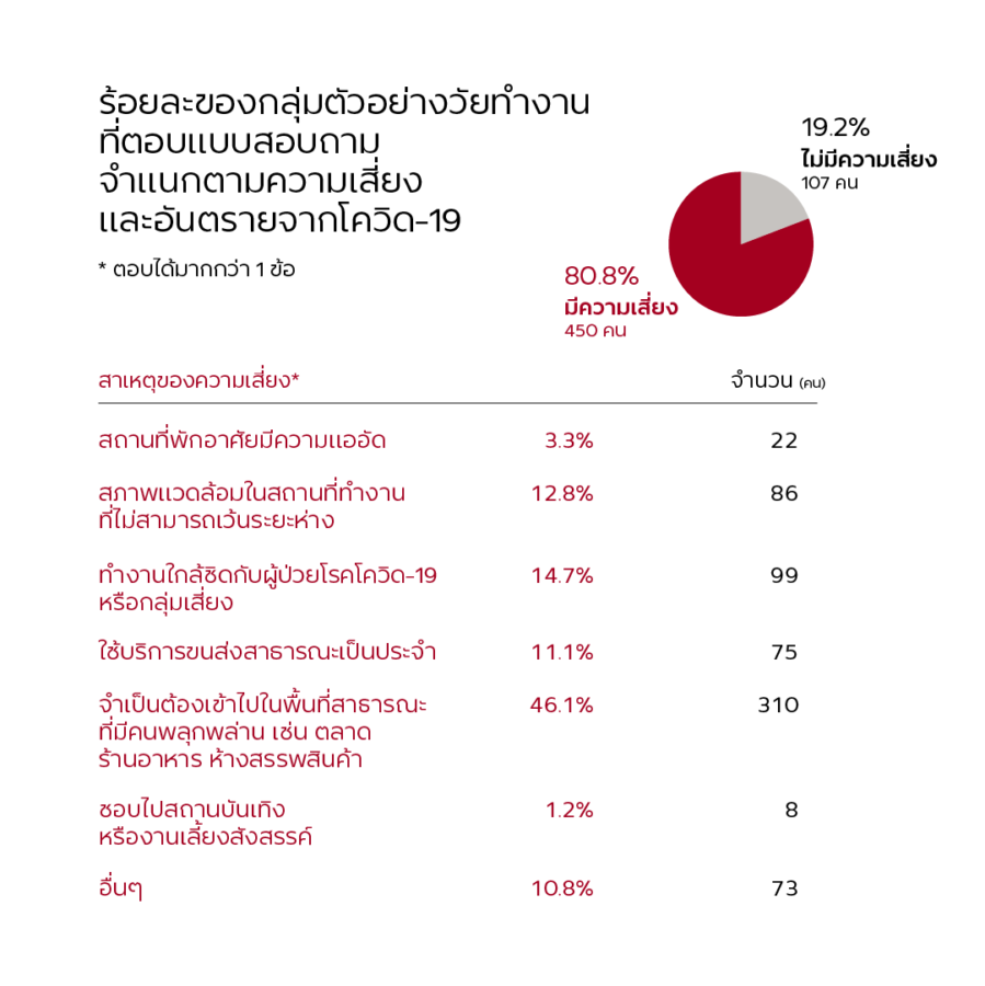 ความรู้สึก ‘ไม่ปลอดภัย’ ดังกล่าว เกิดขึ้นเพราะวิถีชีวิตประจำวันล้วนถูกสถานการณ์บังคับให้จำเป็นต้องเข้าไปในจุดเสี่ยง เห็นได้จากผู้ตอบแบบสอบถาม 310 คนที่มองว่าตนเองมีความเสี่ยงเพราะจำเป็นต้องเข้าไปในสถานที่พลุกพล่าน เช่น ตลาด ร้านอาหาร หรือห้างสรรพสินค้า เป็นต้น จำนวนดังกล่าวนี้คิดเป็นร้อยละ 46.1 จากทั้งหมด ตามมาด้วยเหตุผลของการต้องทำงานใกล้ชิดผู้ติดเชื้อหรือกลุ่มเสี่ยง ร้อยละ 14.7 สภาพแวดล้อมการทำงานที่เว้นระยะห่างไม่ได้ ร้อยละ 12.8 และการใช้บริการขนส่งสาธารณะเป็นประจำ ร้อยละ 11.1 (ตอบได้มากกว่า 1 ข้อ)