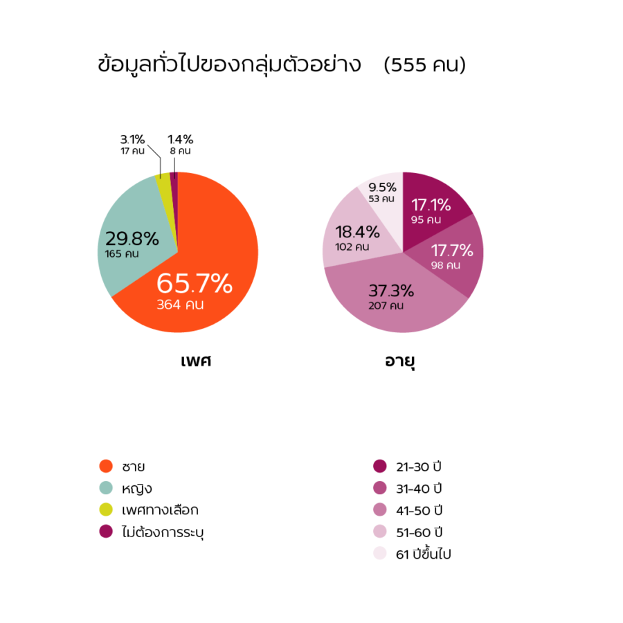 ‘โครงการวิจัย โควิด-19 กับสังคมไทย: บันทึกวิกฤติและประสบการณ์การรับมือไวรัสโคโรนา’ โดย ศูนย์มานุษยวิทยาสิรินธร (ศมส.) สำรวจสอบถามการรับรู้ข่าวสารข้อมูลโควิด-19 ไปยังกลุ่มวัยทำงานจำนวน 555 คน ประกอบด้วย เพศชาย จำนวน 364 คน (ร้อยละ 65.7 เปอร์เซ็นต์) เพศหญิง 165 คน (ร้อยละ 29.8) และเป็นเพศทางเลือกอีก 17 คน (ร้อยละ 3.1)