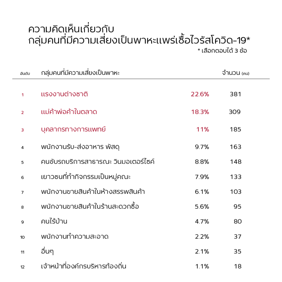 ความหวาดกลัวดังกล่าวมีสาเหตุจากข้อเท็จจริงว่า บางอาชีพไม่สามารถหลีกเลี่ยงการพบปะผู้คนหรือการอยู่ในบริบทเสี่ยงทำให้เกิดการติดเชื้อได้ โดยแบบสอบถามหัวข้อ ‘ความคิดเห็นเกี่ยวกับกลุ่มคนที่มีความเสี่ยงเป็นพาหะแพร่เชื้อไวรัสโควิด-19’ แสดงให้เห็นว่าอาชีพอย่าง แรงงานต่างชาติ แม่ค้าพ่อค้าในตลาด และ บุคลากรทางการแพทย์ ถูกมองว่ามีโอกาสเป็นพาหะของเชื้อได้ถึงร้อยละ 22.6 ร้อยละ 18.3 และ ร้อยละ 11 จากจำนวนผู้ตอบแบบสอบถามทั้งหมด ตามลำดับ