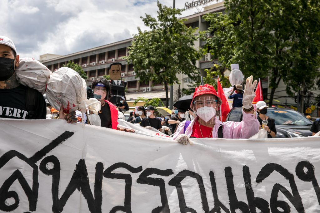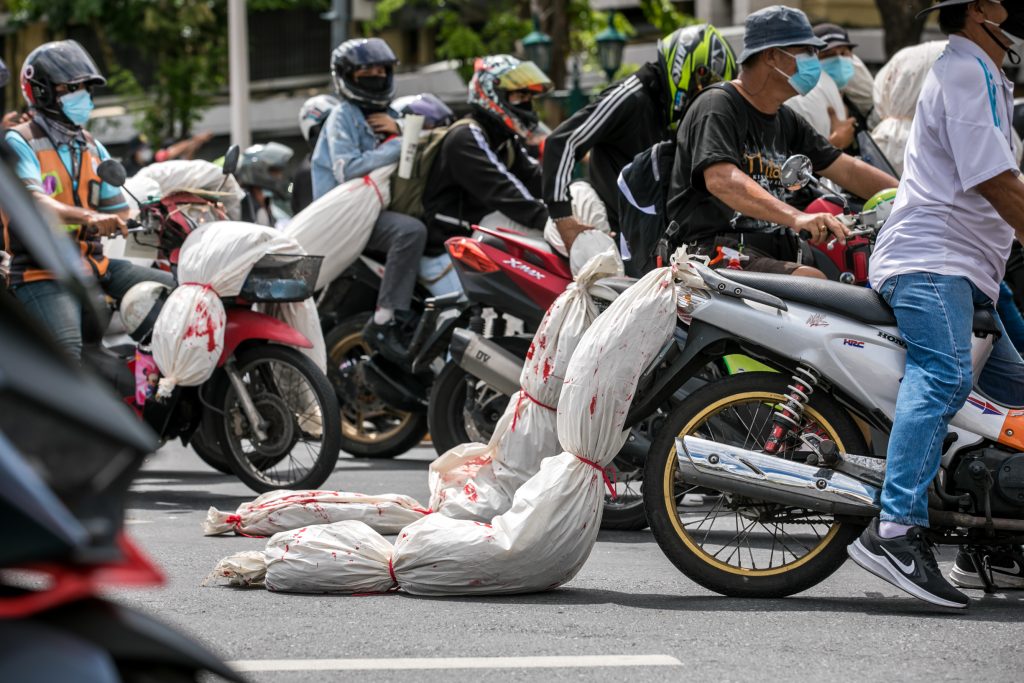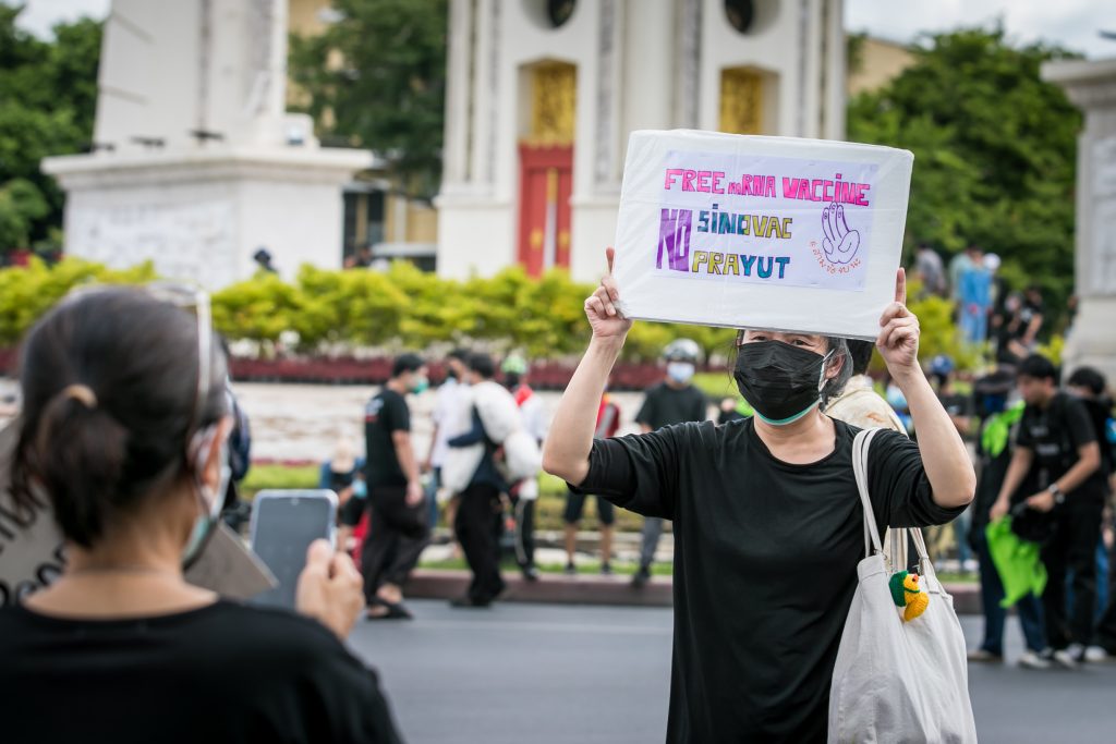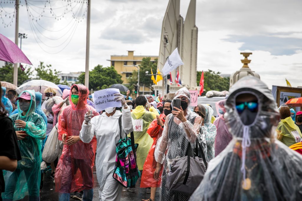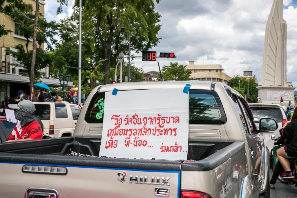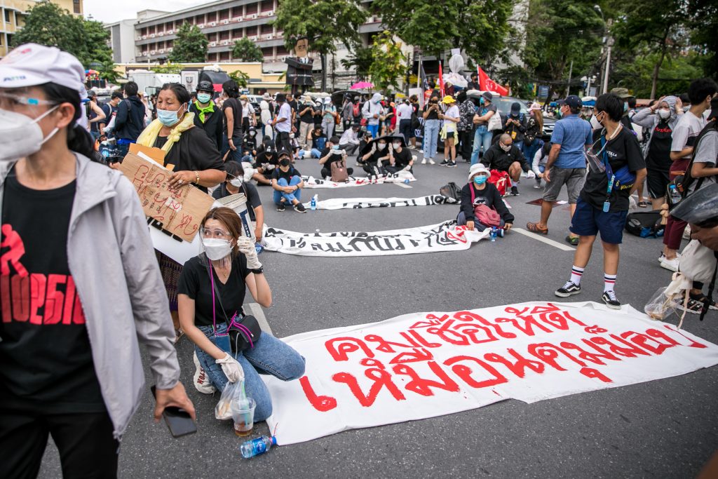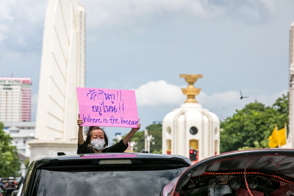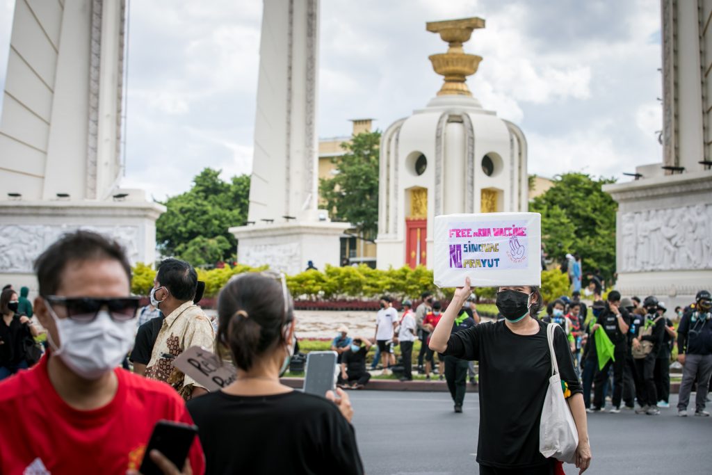ภาพกิจกรรมการชุมนุมท่ามกลางการแพร่ระบาดของโควิด-19 นำโดยเยาวชนปลดแอก พร้อมกลุ่มแนวร่วมต่างๆ กับข้อเรียกร้อง 3 ข้อ คือ พล.อ.ประยุทธ์ จันทร์โอชา ต้องลาออกโดยไม่มีเงื่อนไข ปรับลดงบประมาณสถาบัน-กองทัพเพื่อนำมาใช้แก้ปัญหาโควิด และ หยุดซื้อวัคซีนด้อยคุณภาพที่เอื้อประโยชน์ต่อนายทุน แล้วไปจัดหาวัคซีนคุณภาพสูงมาฉีดให้กับประชาชนโดยเร็วที่สุด ผู้ชุมนุมตั้งขบวนบริเวณอนุสาวรีย์ประชาธิปไตย ก่อนมุ่งหน้าไปยังทำเนียบรัฐบาล โดยมีการแสดงออกในหลายรูปแบบ ทั้งป้ายข้อความต่างๆ หุ่นฟางที่ทำคล้ายศพเป็นสัญลักษณ์แทนผู้ที่เสียชีวิตจากโควิดจำนวนมากภายใต้การบริหารที่ล้มเหลวของรัฐบาล