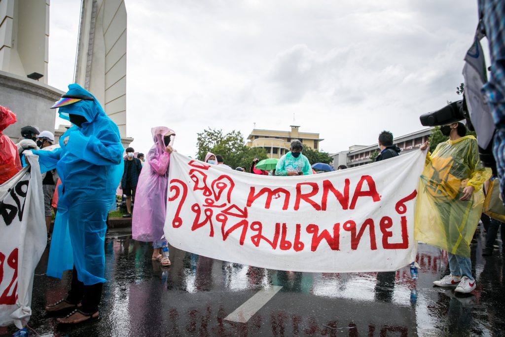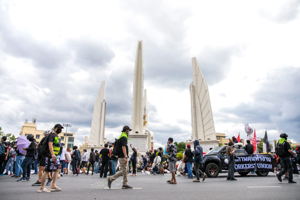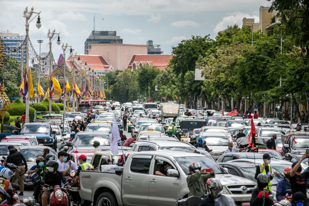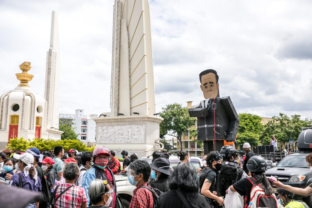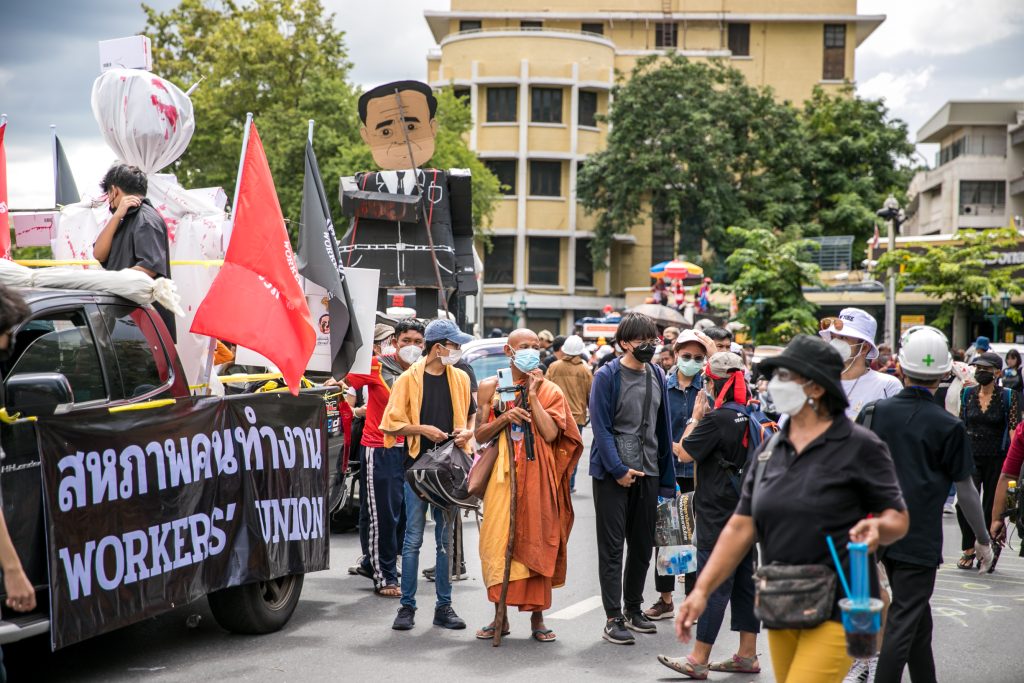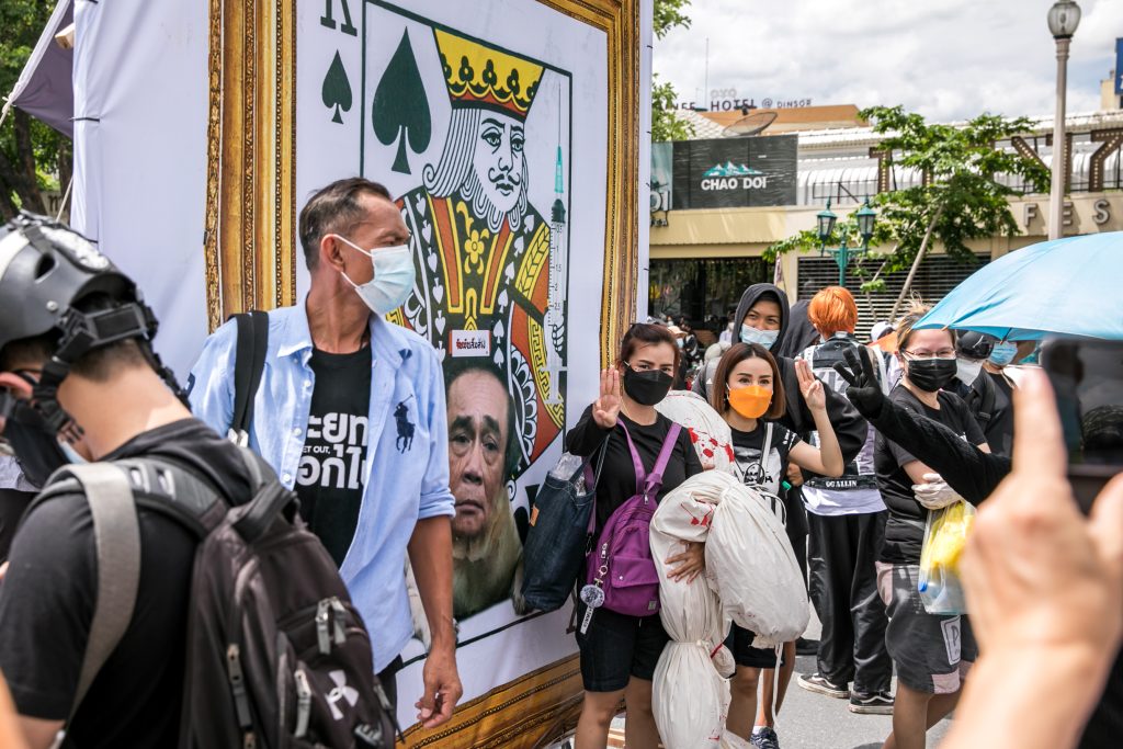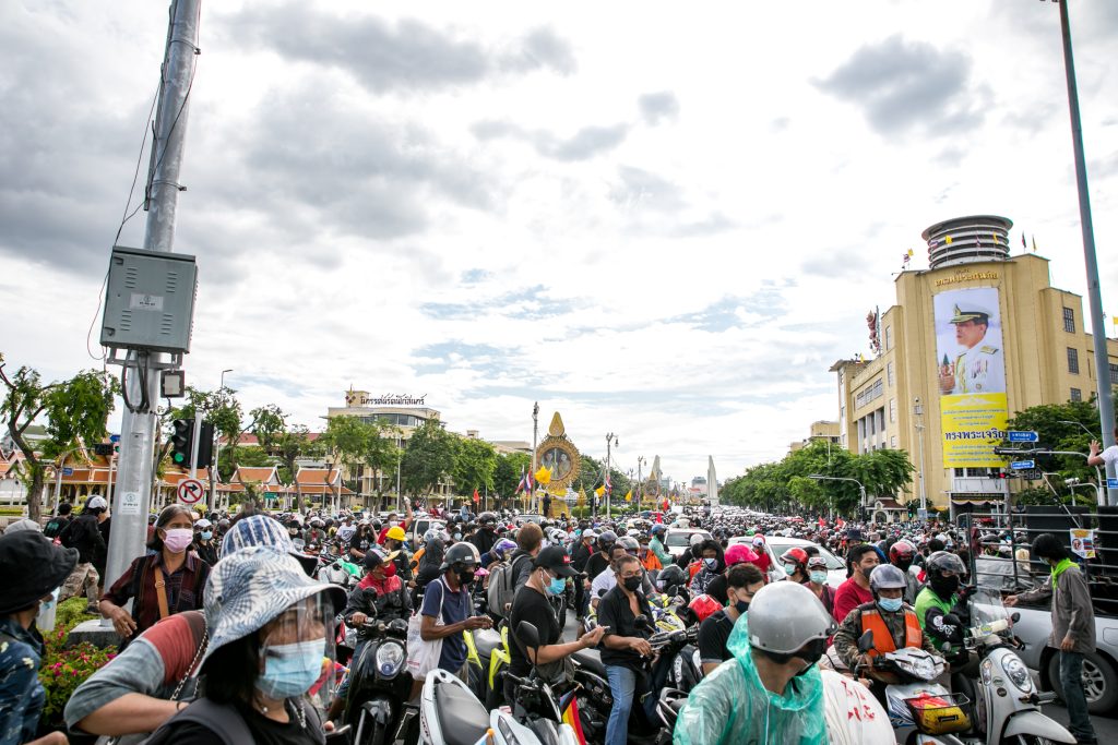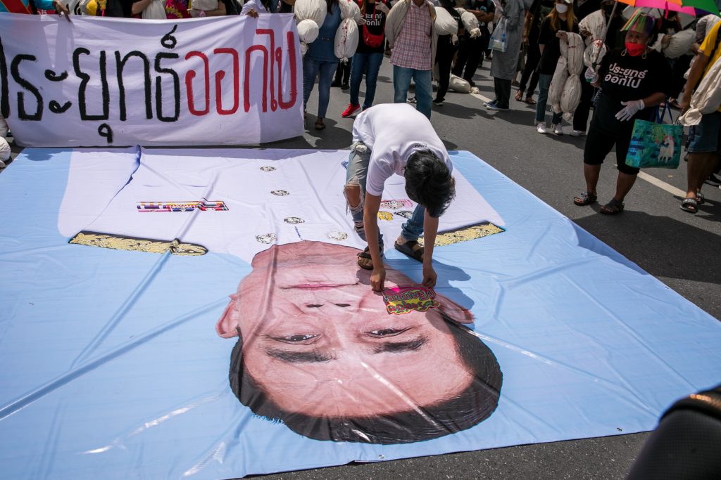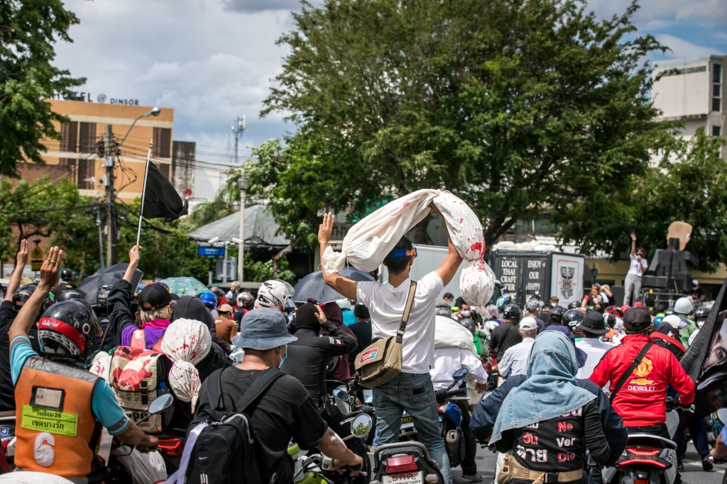 ภาพกิจกรรมการชุมนุมท่ามกลางการแพร่ระบาดของโควิด-19 นำโดยเยาวชนปลดแอก พร้อมกลุ่มแนวร่วมต่างๆ กับข้อเรียกร้อง 3 ข้อ คือ พล.อ.ประยุทธ์ จันทร์โอชา ต้องลาออกโดยไม่มีเงื่อนไข ปรับลดงบประมาณสถาบัน-กองทัพเพื่อนำมาใช้แก้ปัญหาโควิด และ หยุดซื้อวัคซีนด้อยคุณภาพที่เอื้อประโยชน์ต่อนายทุน แล้วไปจัดหาวัคซีนคุณภาพสูงมาฉีดให้กับประชาชนโดยเร็วที่สุด ผู้ชุมนุมตั้งขบวนบริเวณอนุสาวรีย์ประชาธิปไตย ก่อนมุ่งหน้าไปยังทำเนียบรัฐบาล โดยมีการแสดงออกในหลายรูปแบบ ทั้งป้ายข้อความต่างๆ หุ่นฟางที่ทำคล้ายศพเป็นสัญลักษณ์แทนผู้ที่เสียชีวิตจากโควิดจำนวนมากภายใต้การบริหารที่ล้มเหลวของรัฐบาล