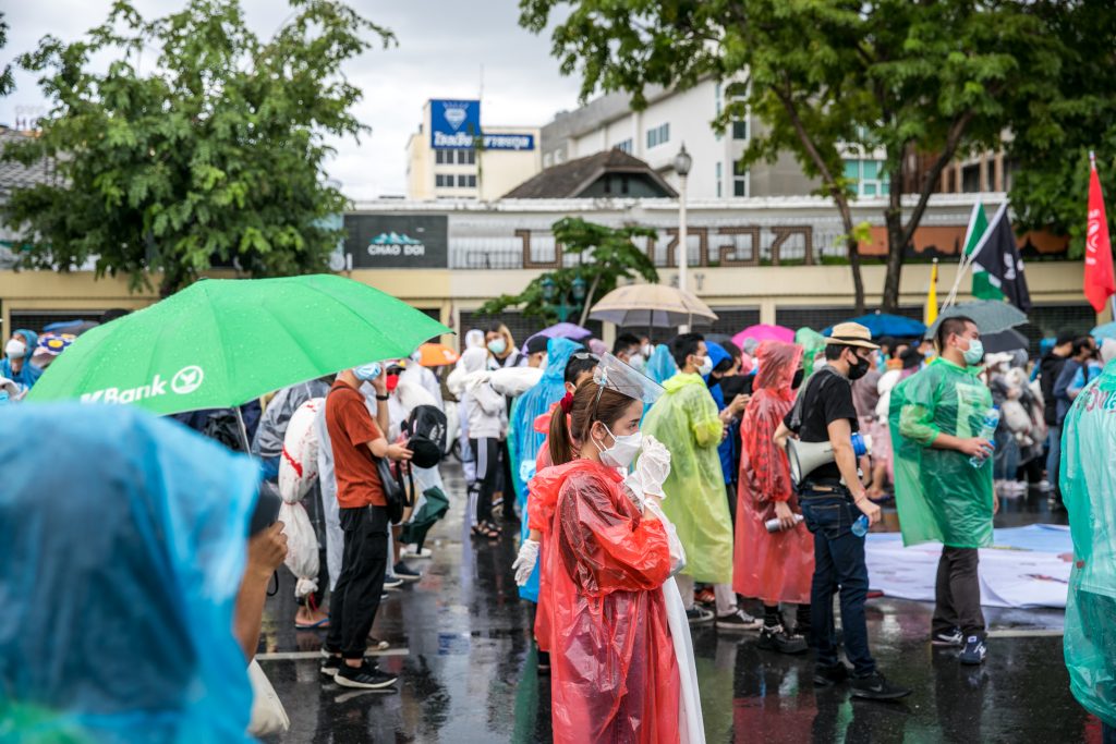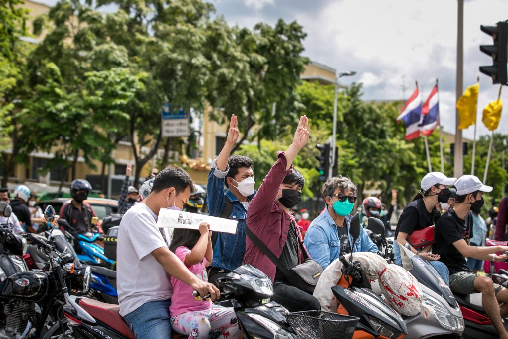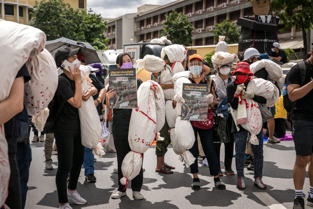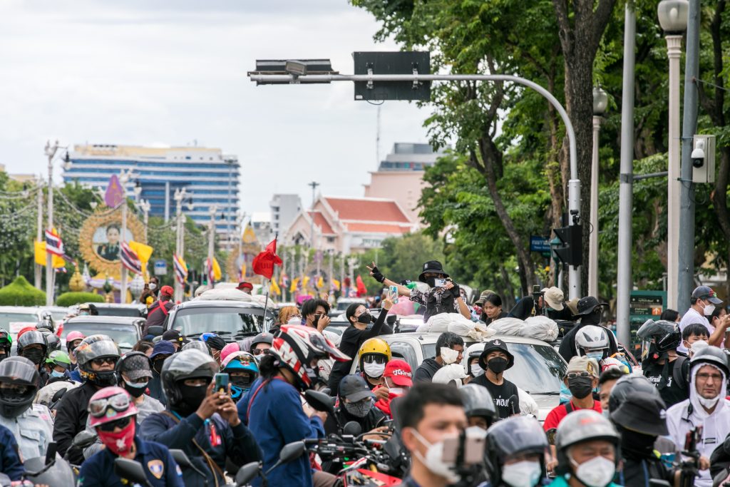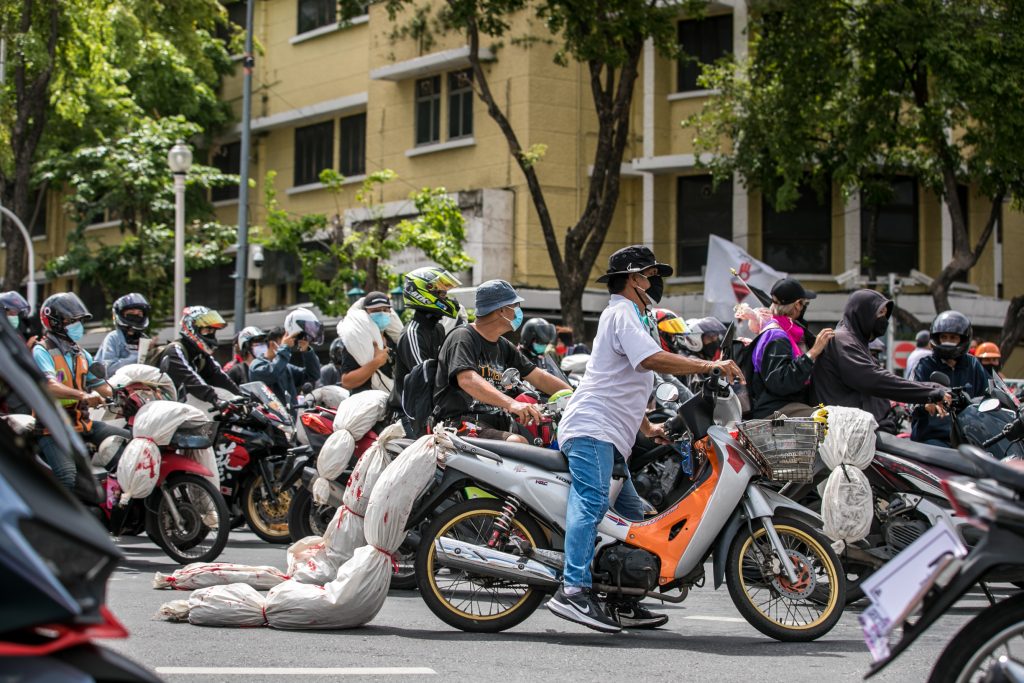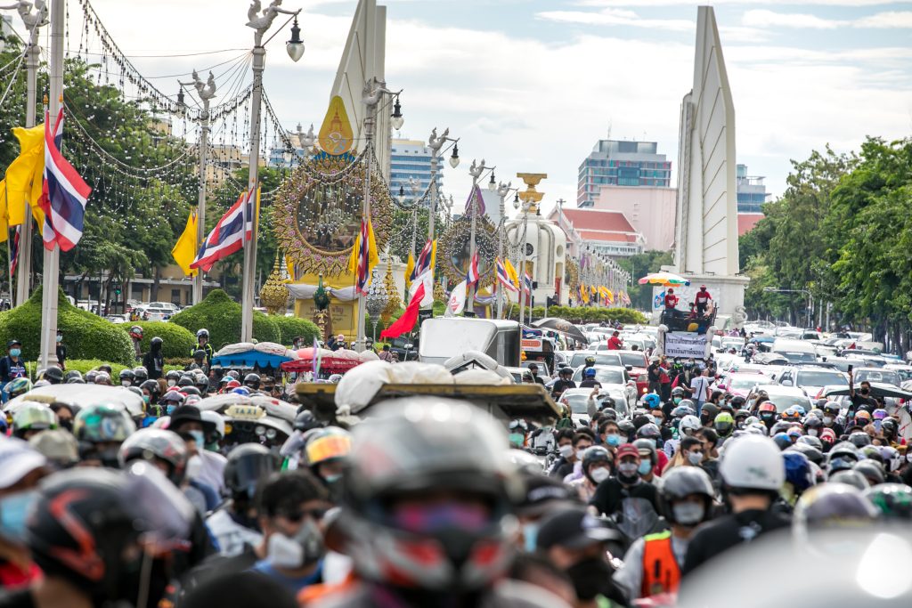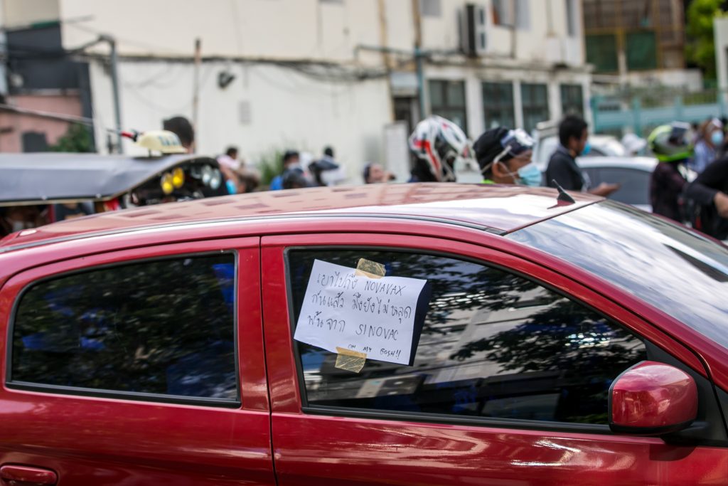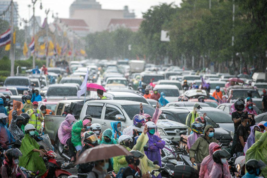 ภาพกิจกรรมการชุมนุมท่ามกลางการแพร่ระบาดของโควิด-19 นำโดยเยาวชนปลดแอก พร้อมกลุ่มแนวร่วมต่างๆ กับข้อเรียกร้อง 3 ข้อ คือ พล.อ.ประยุทธ์ จันทร์โอชา ต้องลาออกโดยไม่มีเงื่อนไข ปรับลดงบประมาณสถาบัน-กองทัพเพื่อนำมาใช้แก้ปัญหาโควิด และ หยุดซื้อวัคซีนด้อยคุณภาพที่เอื้อประโยชน์ต่อนายทุน แล้วไปจัดหาวัคซีนคุณภาพสูงมาฉีดให้กับประชาชนโดยเร็วที่สุด ผู้ชุมนุมตั้งขบวนบริเวณอนุสาวรีย์ประชาธิปไตย ก่อนมุ่งหน้าไปยังทำเนียบรัฐบาล โดยมีการแสดงออกในหลายรูปแบบ ทั้งป้ายข้อความต่างๆ หุ่นฟางที่ทำคล้ายศพเป็นสัญลักษณ์แทนผู้ที่เสียชีวิตจากโควิดจำนวนมากภายใต้การบริหารที่ล้มเหลวของรัฐบาล
