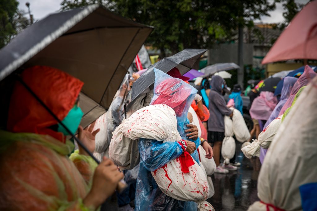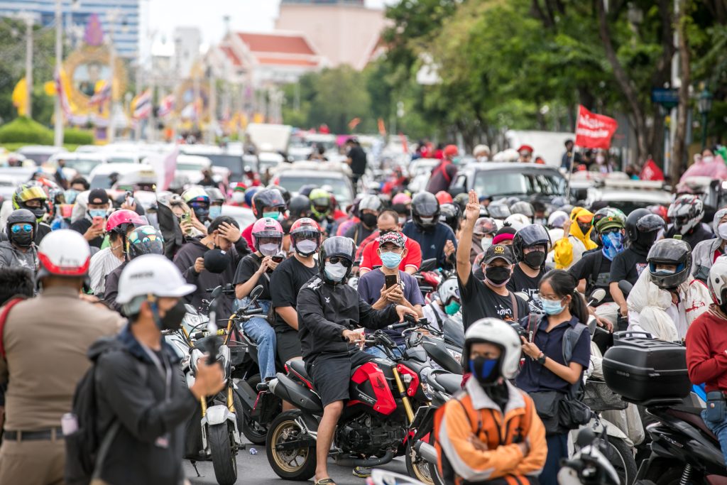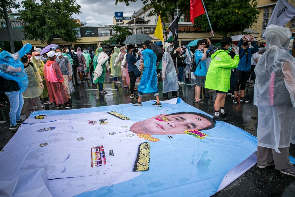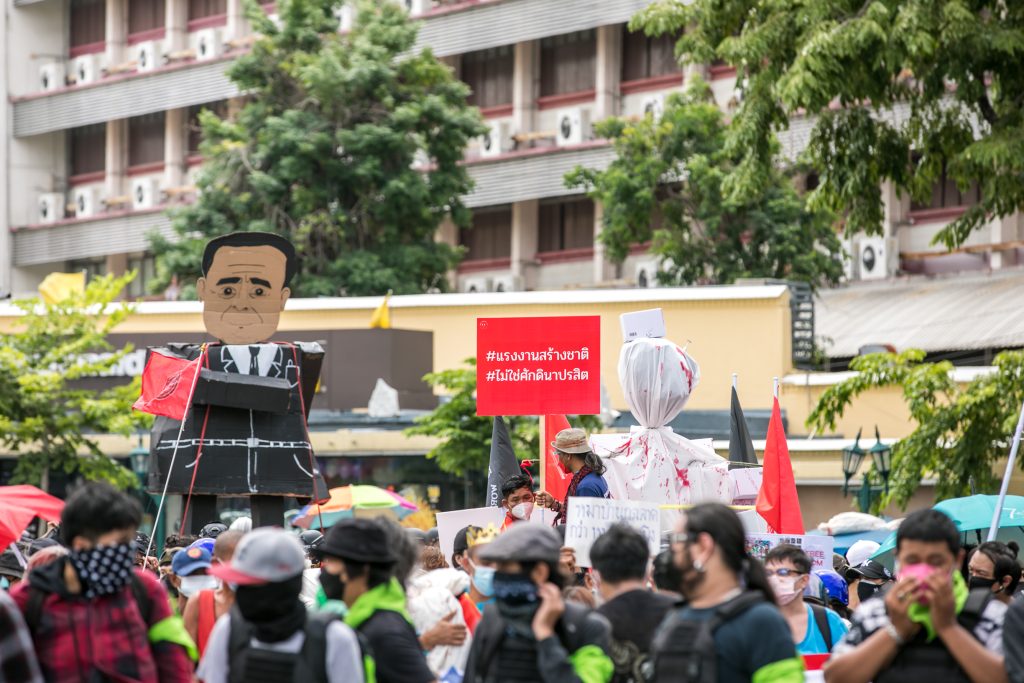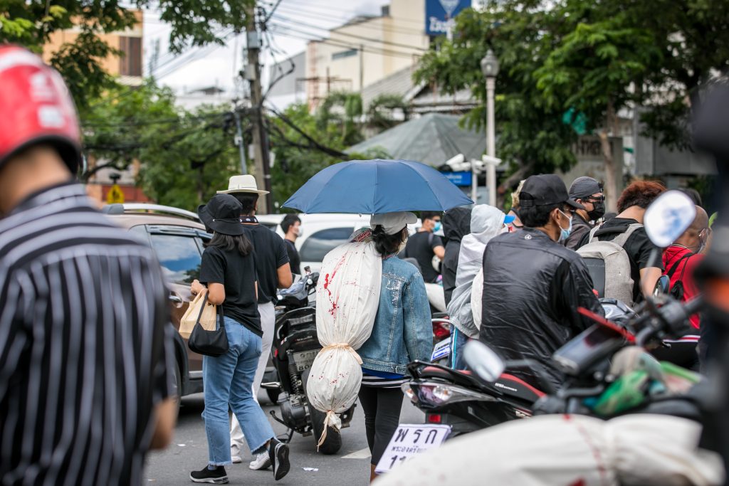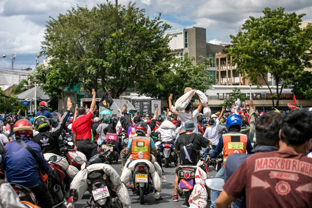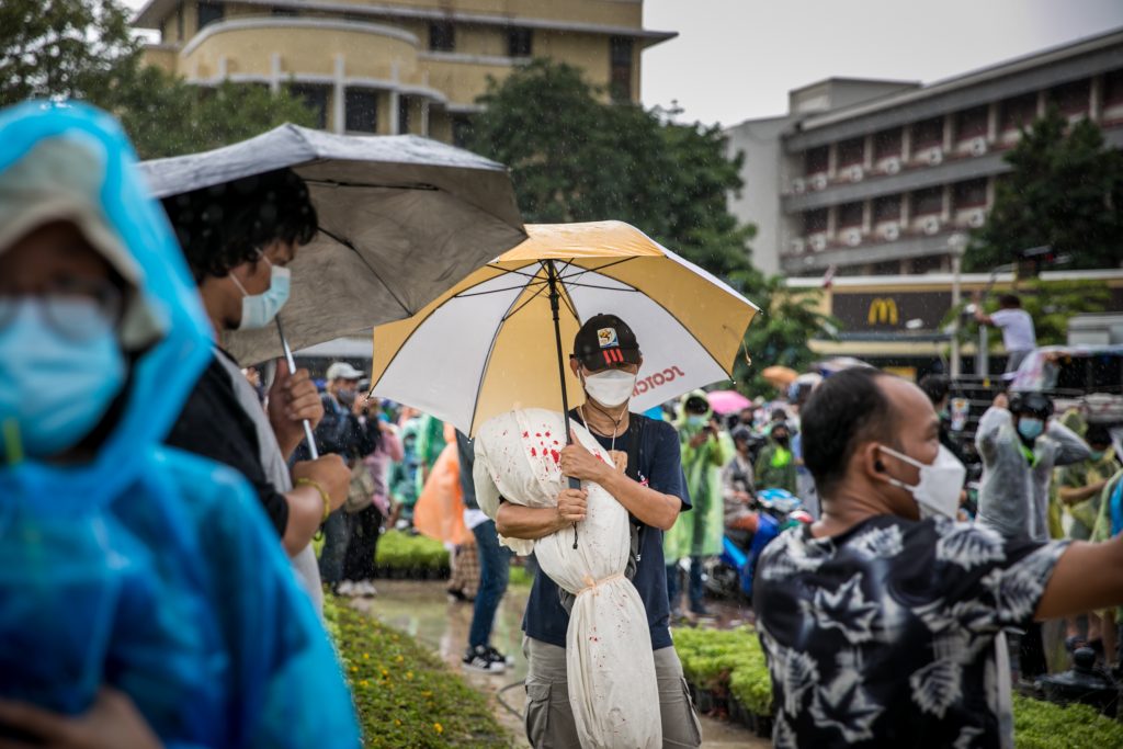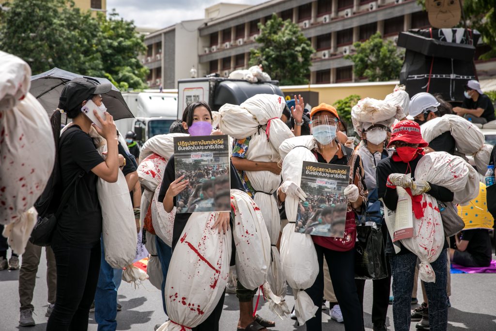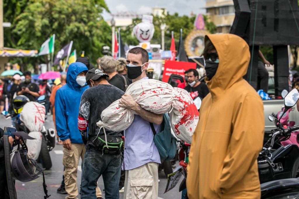ภาพกิจกรรมการชุมนุมท่ามกลางการแพร่ระบาดของโควิด-19 นำโดยเยาวชนปลดแอก พร้อมกลุ่มแนวร่วมต่างๆ กับข้อเรียกร้อง 3 ข้อ คือ พล.อ.ประยุทธ์ จันทร์โอชา ต้องลาออกโดยไม่มีเงื่อนไข ปรับลดงบประมาณสถาบัน-กองทัพเพื่อนำมาใช้แก้ปัญหาโควิด และ หยุดซื้อวัคซีนด้อยคุณภาพที่เอื้อประโยชน์ต่อนายทุน แล้วไปจัดหาวัคซีนคุณภาพสูงมาฉีดให้กับประชาชนโดยเร็วที่สุด ผู้ชุมนุมตั้งขบวนบริเวณอนุสาวรีย์ประชาธิปไตย ก่อนมุ่งหน้าไปยังทำเนียบรัฐบาล โดยมีการแสดงออกในหลายรูปแบบ ทั้งป้ายข้อความต่างๆ หุ่นฟางที่ทำคล้ายศพเป็นสัญลักษณ์แทนผู้ที่เสียชีวิตจากโควิดจำนวนมากภายใต้การบริหารที่ล้มเหลวของรัฐบาล