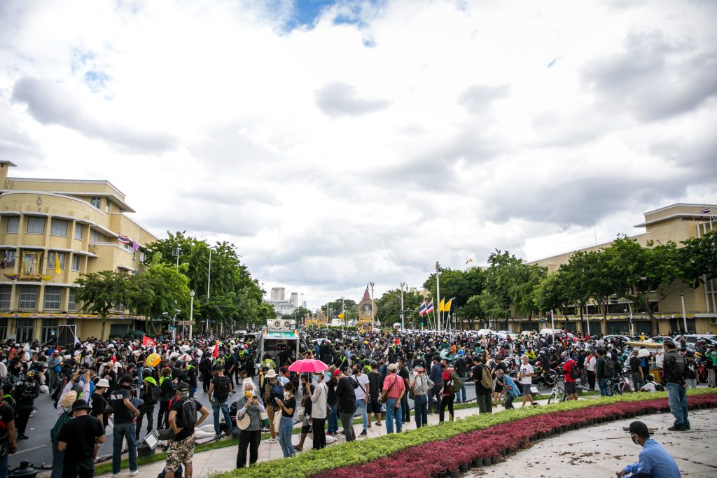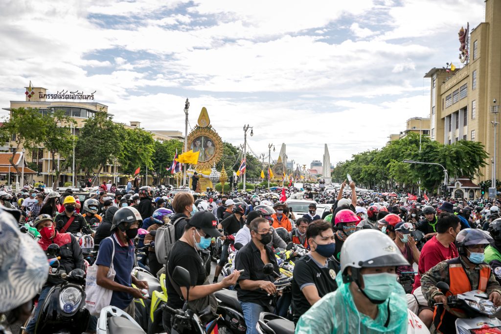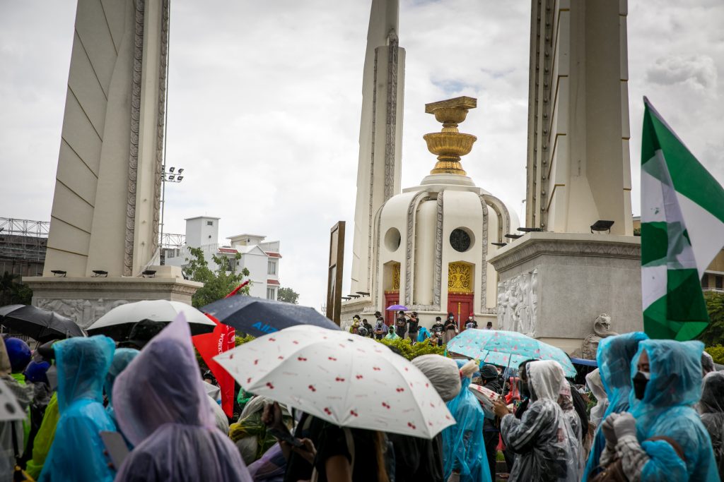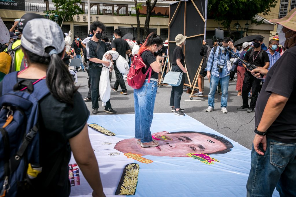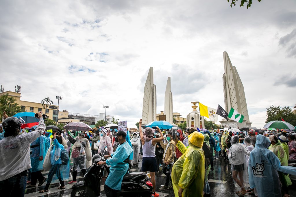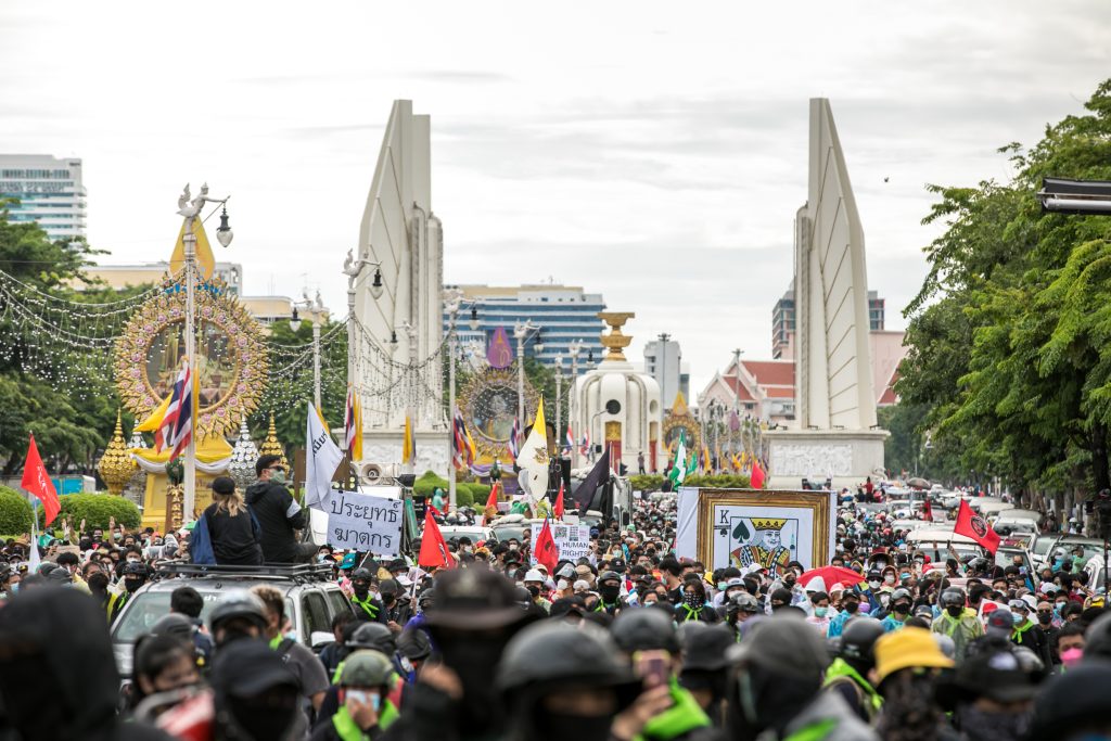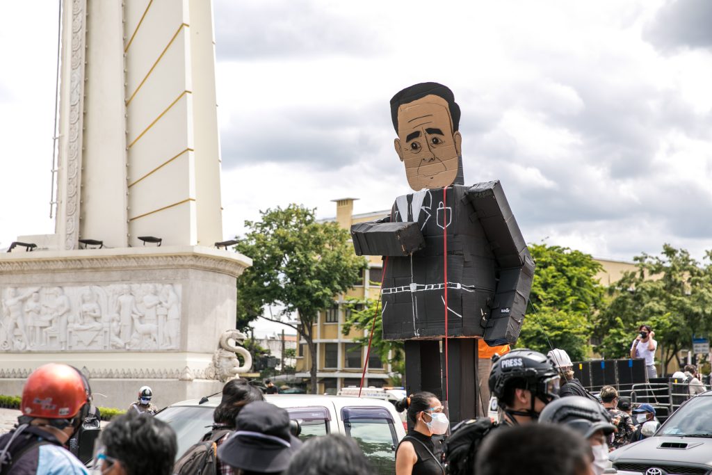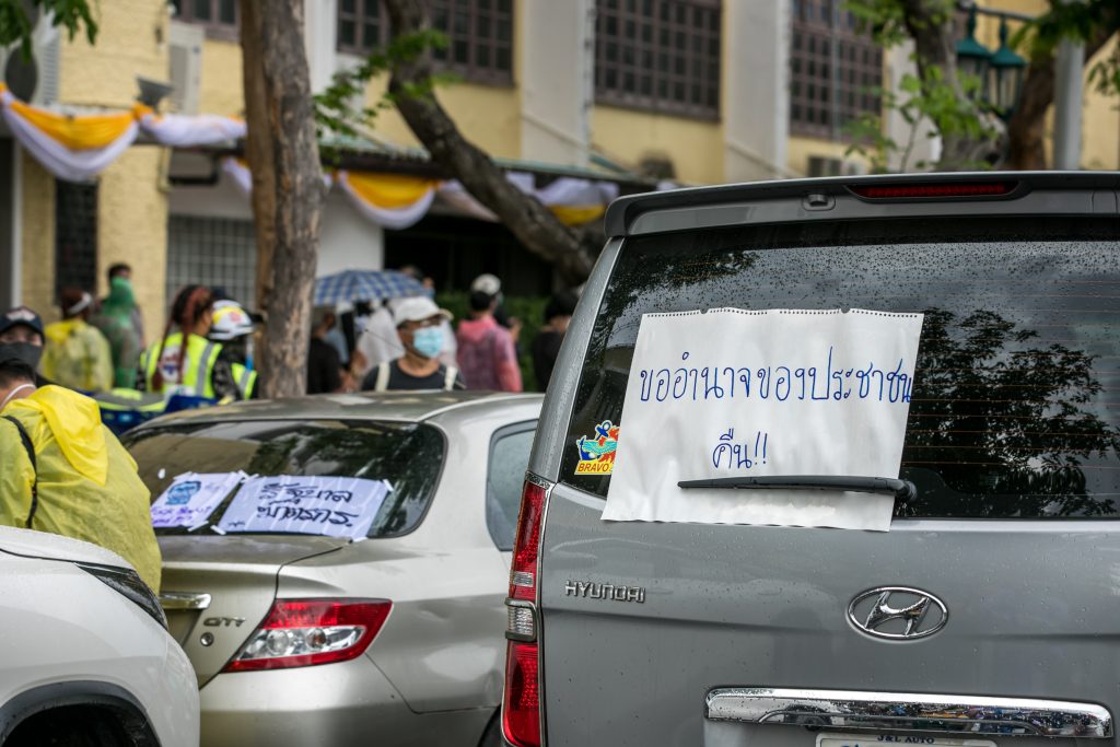 ภาพกิจกรรมการชุมนุมท่ามกลางการแพร่ระบาดของโควิด-19 นำโดยเยาวชนปลดแอก พร้อมกลุ่มแนวร่วมต่างๆ กับข้อเรียกร้อง 3 ข้อ คือ พล.อ.ประยุทธ์ จันทร์โอชา ต้องลาออกโดยไม่มีเงื่อนไข ปรับลดงบประมาณสถาบัน-กองทัพเพื่อนำมาใช้แก้ปัญหาโควิด และ หยุดซื้อวัคซีนด้อยคุณภาพที่เอื้อประโยชน์ต่อนายทุน แล้วไปจัดหาวัคซีนคุณภาพสูงมาฉีดให้กับประชาชนโดยเร็วที่สุด ผู้ชุมนุมตั้งขบวนบริเวณอนุสาวรีย์ประชาธิปไตย ก่อนมุ่งหน้าไปยังทำเนียบรัฐบาล โดยมีการแสดงออกในหลายรูปแบบ ทั้งป้ายข้อความต่างๆ หุ่นฟางที่ทำคล้ายศพเป็นสัญลักษณ์แทนผู้ที่เสียชีวิตจากโควิดจำนวนมากภายใต้การบริหารที่ล้มเหลวของรัฐบาล