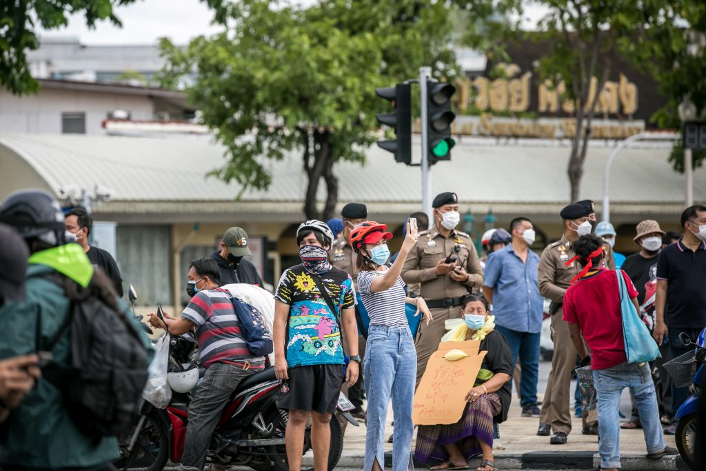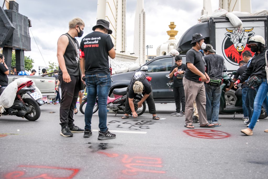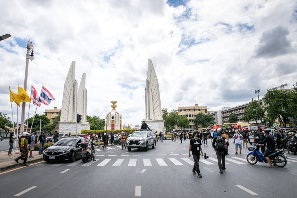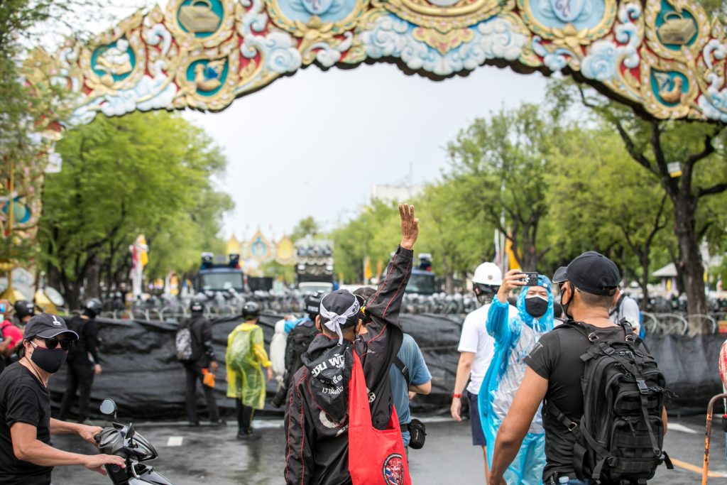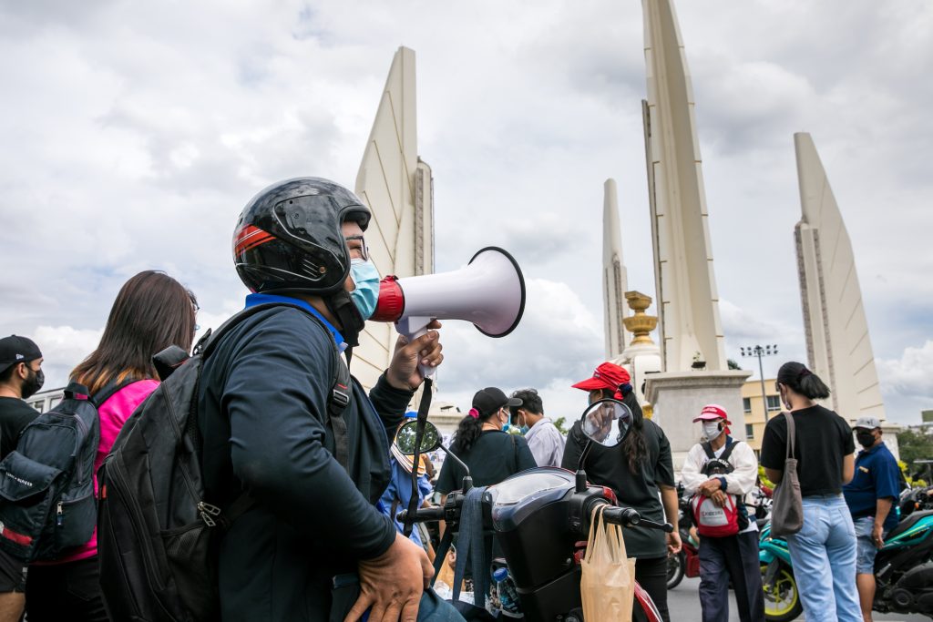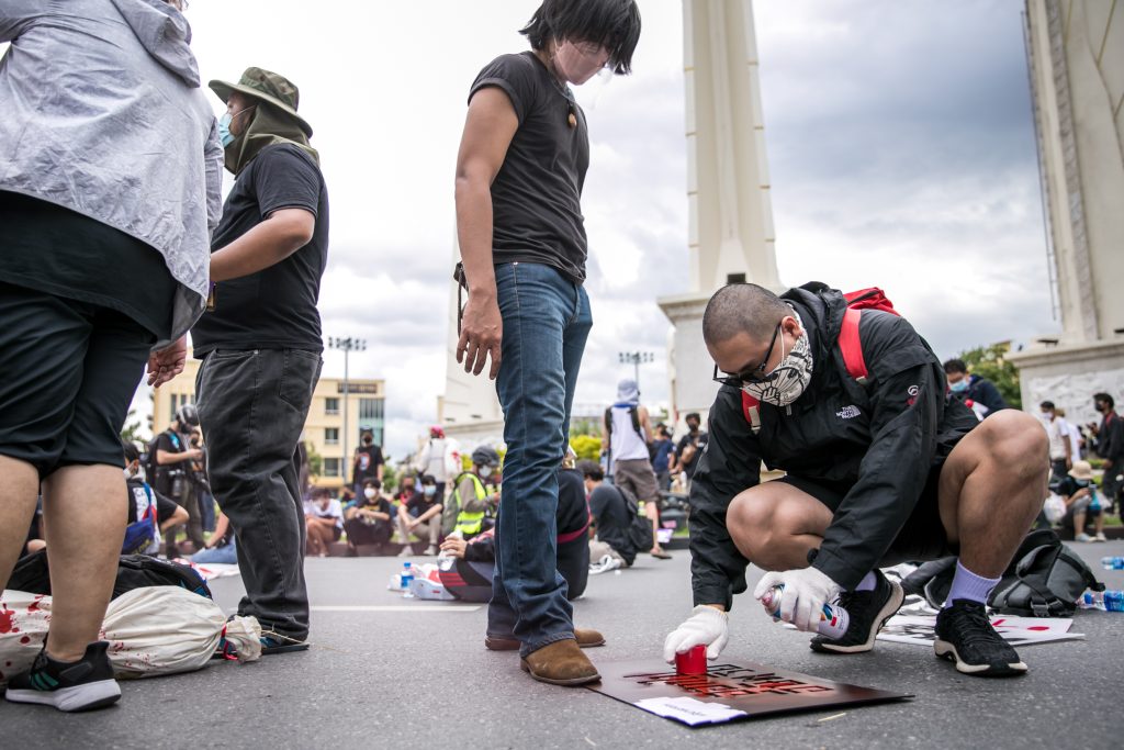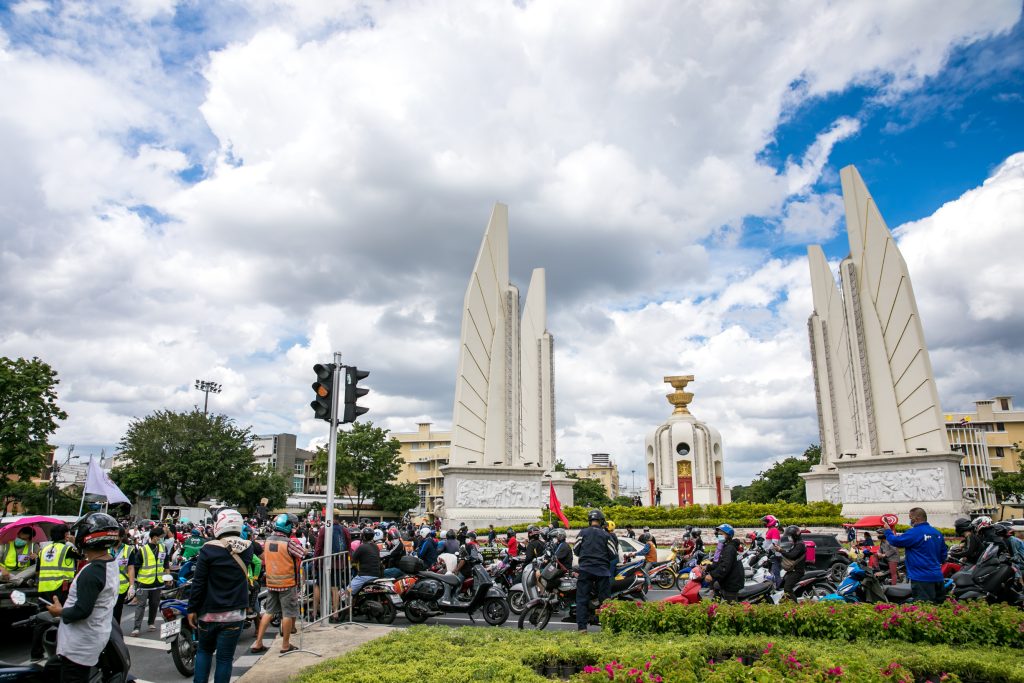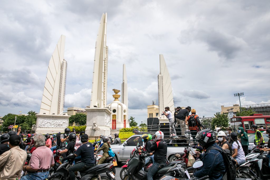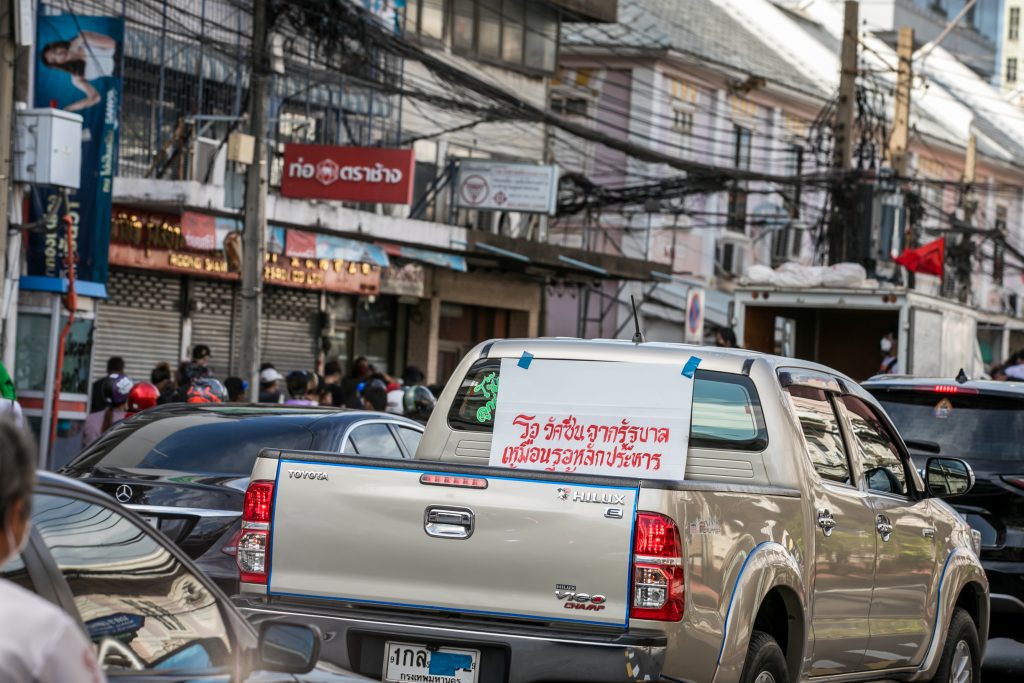 ภาพกิจกรรมการชุมนุมท่ามกลางการแพร่ระบาดของโควิด-19 นำโดยเยาวชนปลดแอก พร้อมกลุ่มแนวร่วมต่างๆ กับข้อเรียกร้อง 3 ข้อ คือ พล.อ.ประยุทธ์ จันทร์โอชา ต้องลาออกโดยไม่มีเงื่อนไข ปรับลดงบประมาณสถาบัน-กองทัพเพื่อนำมาใช้แก้ปัญหาโควิด และ หยุดซื้อวัคซีนด้อยคุณภาพที่เอื้อประโยชน์ต่อนายทุน แล้วไปจัดหาวัคซีนคุณภาพสูงมาฉีดให้กับประชาชนโดยเร็วที่สุด ผู้ชุมนุมตั้งขบวนบริเวณอนุสาวรีย์ประชาธิปไตย ก่อนมุ่งหน้าไปยังทำเนียบรัฐบาล โดยมีการแสดงออกในหลายรูปแบบ ทั้งป้ายข้อความต่างๆ หุ่นฟางที่ทำคล้ายศพเป็นสัญลักษณ์แทนผู้ที่เสียชีวิตจากโควิดจำนวนมากภายใต้การบริหารที่ล้มเหลวของรัฐบาล