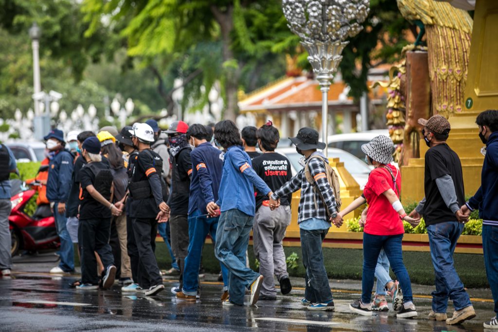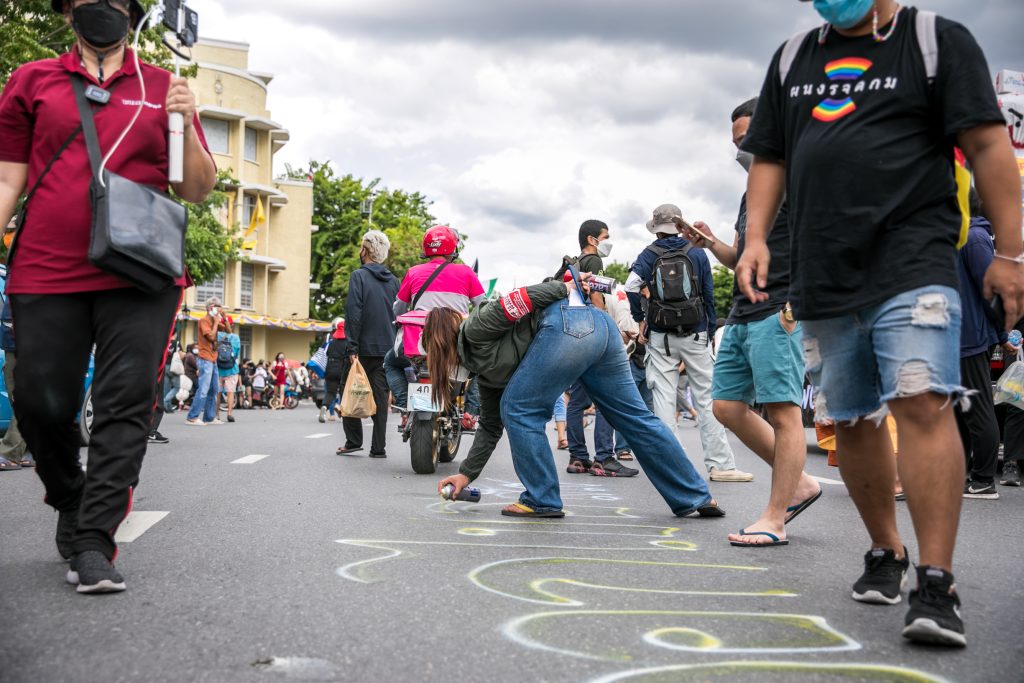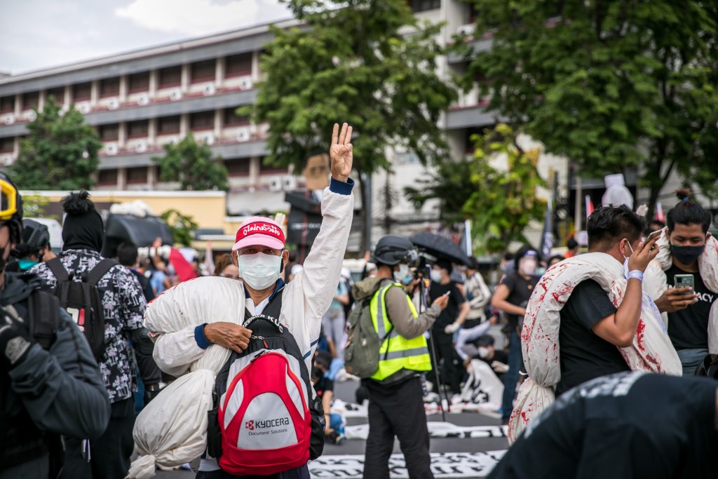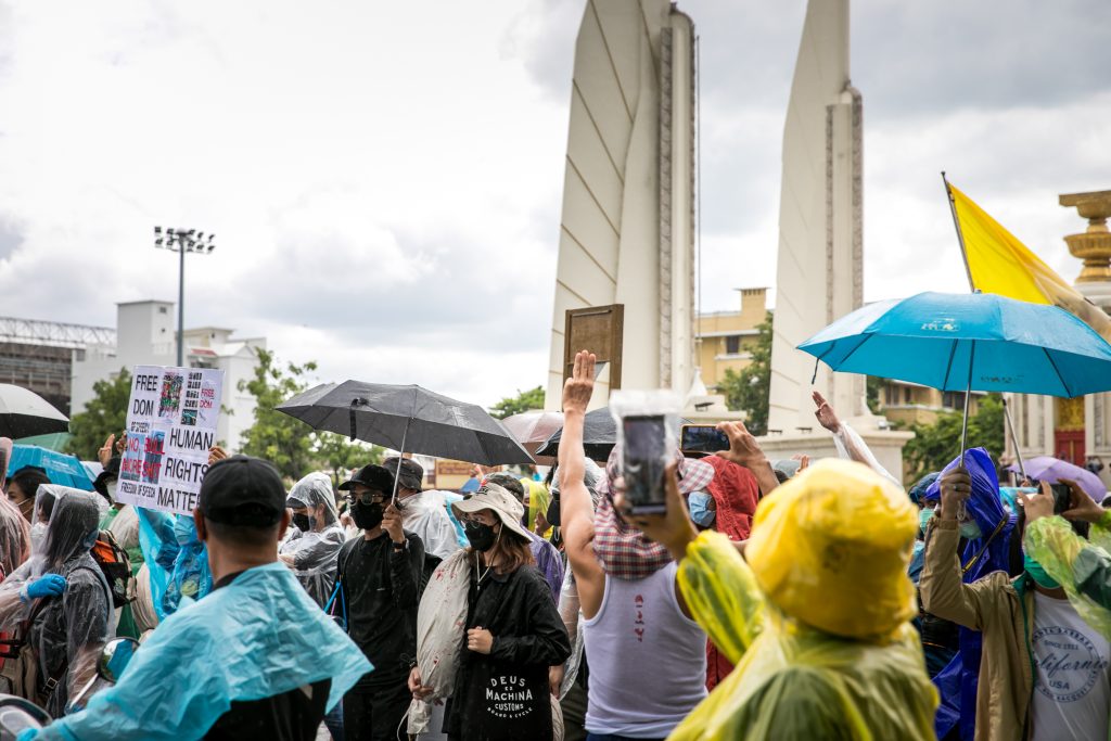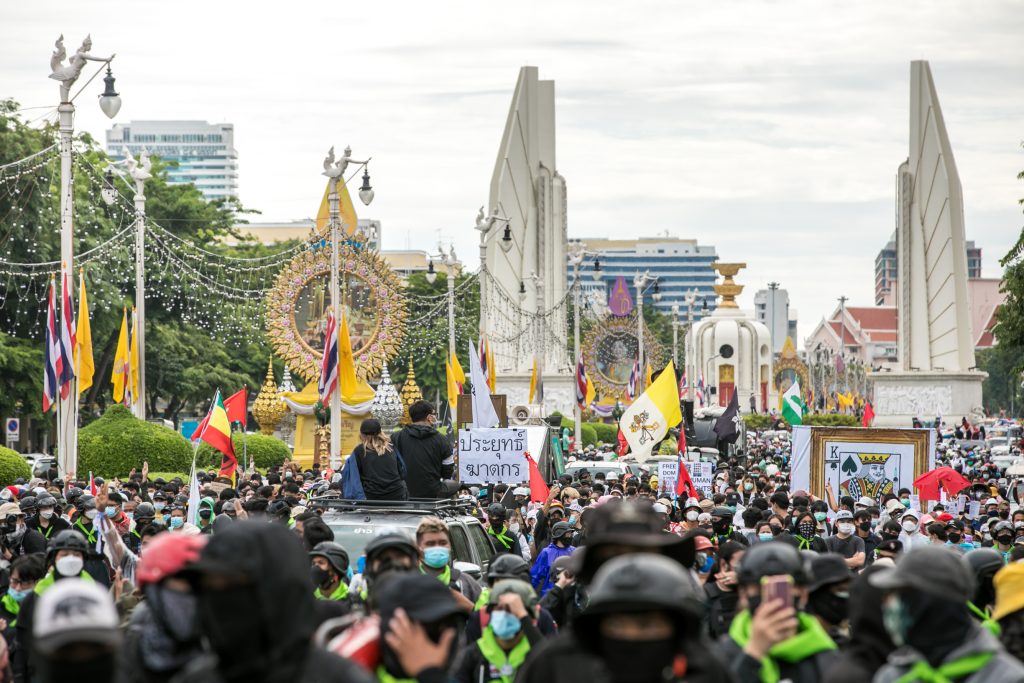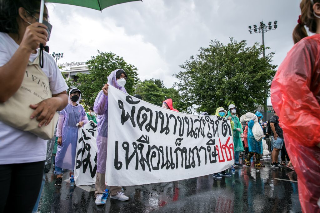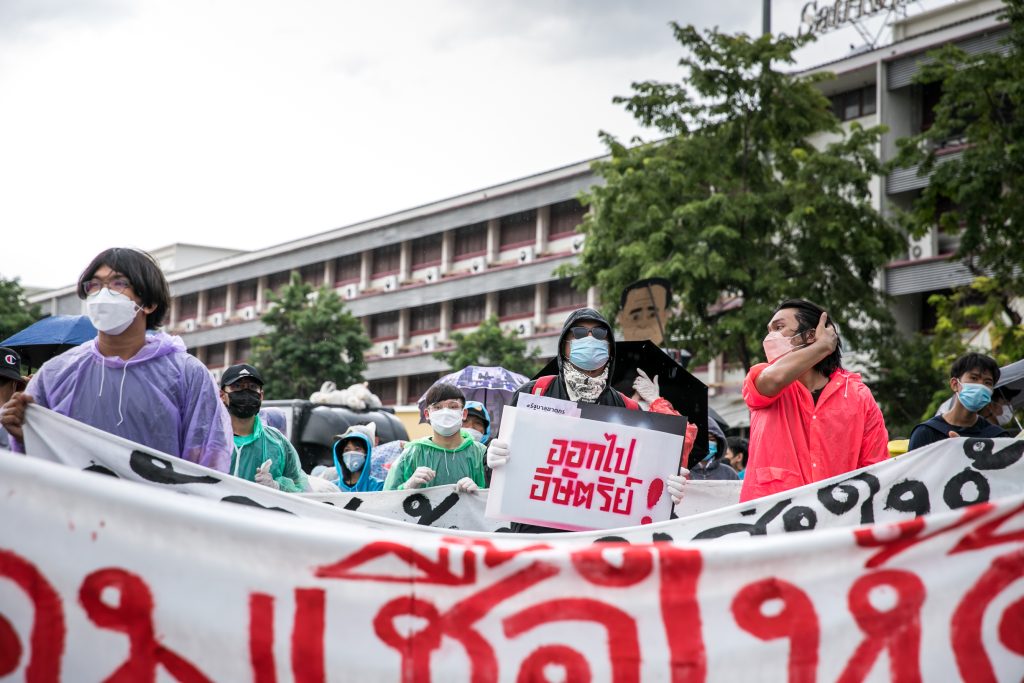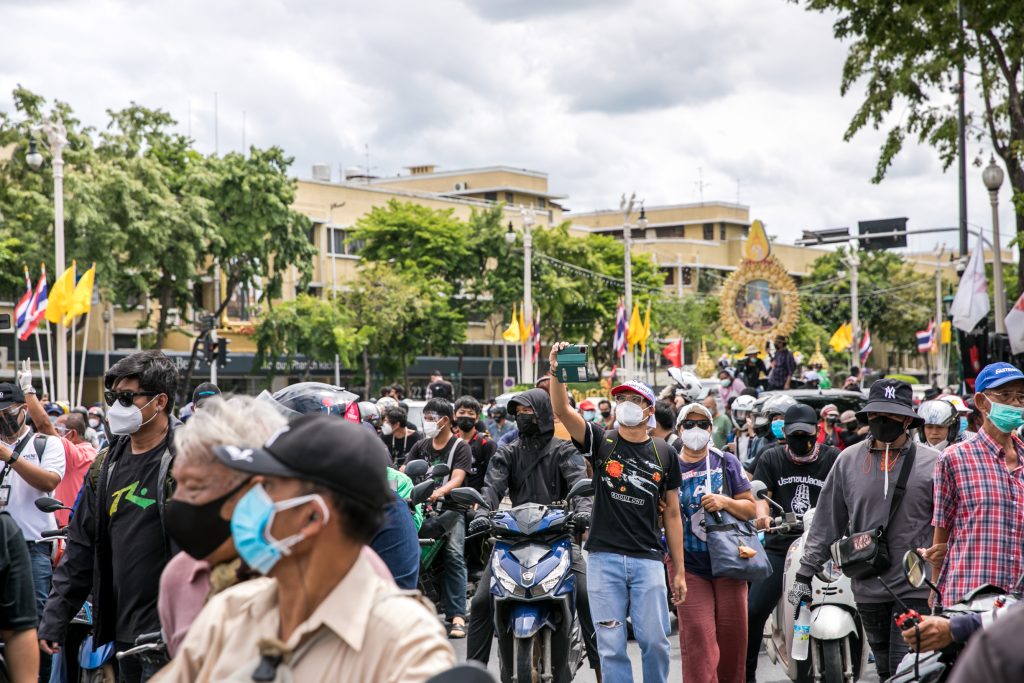 ภาพกิจกรรมการชุมนุมท่ามกลางการแพร่ระบาดของโควิด-19 นำโดยเยาวชนปลดแอก พร้อมกลุ่มแนวร่วมต่างๆ กับข้อเรียกร้อง 3 ข้อ คือ พล.อ.ประยุทธ์ จันทร์โอชา ต้องลาออกโดยไม่มีเงื่อนไข ปรับลดงบประมาณสถาบัน-กองทัพเพื่อนำมาใช้แก้ปัญหาโควิด และ หยุดซื้อวัคซีนด้อยคุณภาพที่เอื้อประโยชน์ต่อนายทุน แล้วไปจัดหาวัคซีนคุณภาพสูงมาฉีดให้กับประชาชนโดยเร็วที่สุด ผู้ชุมนุมตั้งขบวนบริเวณอนุสาวรีย์ประชาธิปไตย ก่อนมุ่งหน้าไปยังทำเนียบรัฐบาล โดยมีการแสดงออกในหลายรูปแบบ ทั้งป้ายข้อความต่างๆ หุ่นฟางที่ทำคล้ายศพเป็นสัญลักษณ์แทนผู้ที่เสียชีวิตจากโควิดจำนวนมากภายใต้การบริหารที่ล้มเหลวของรัฐบาล