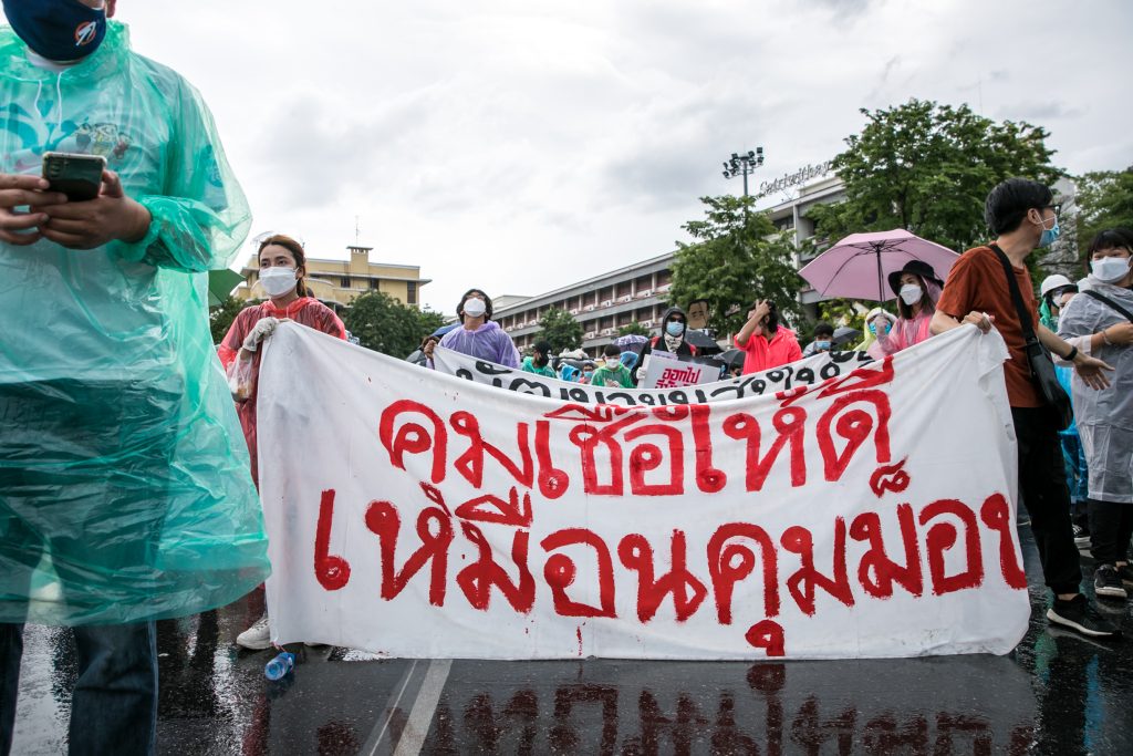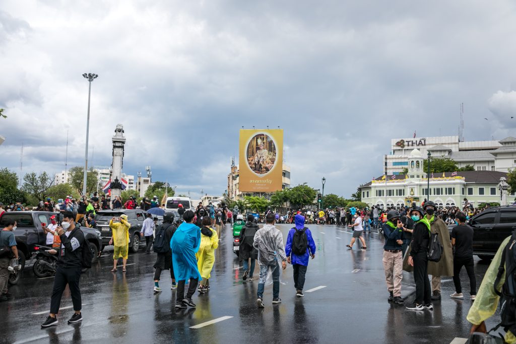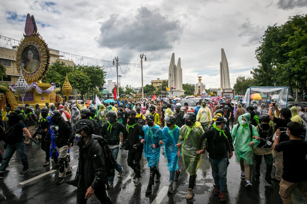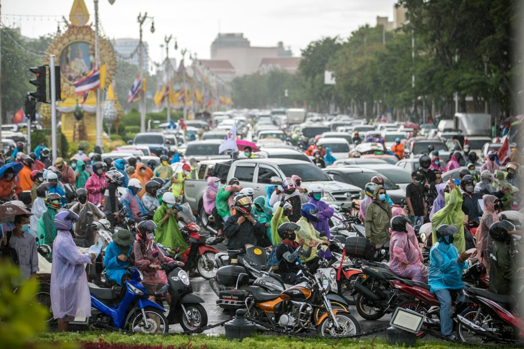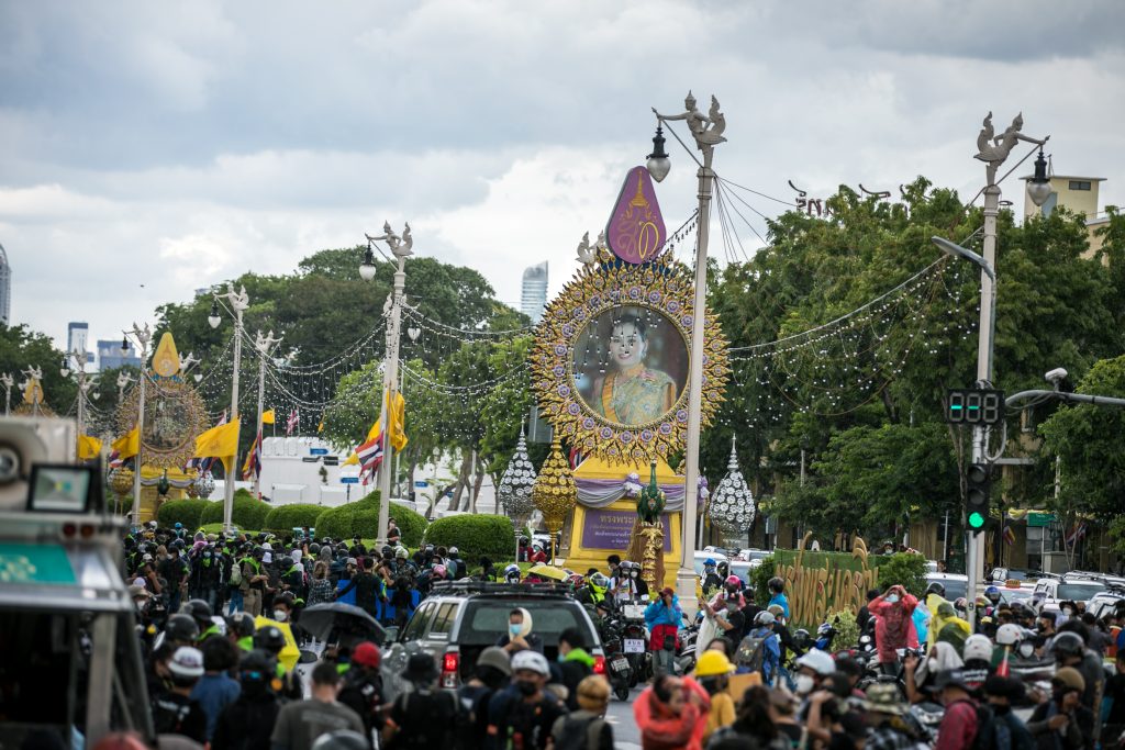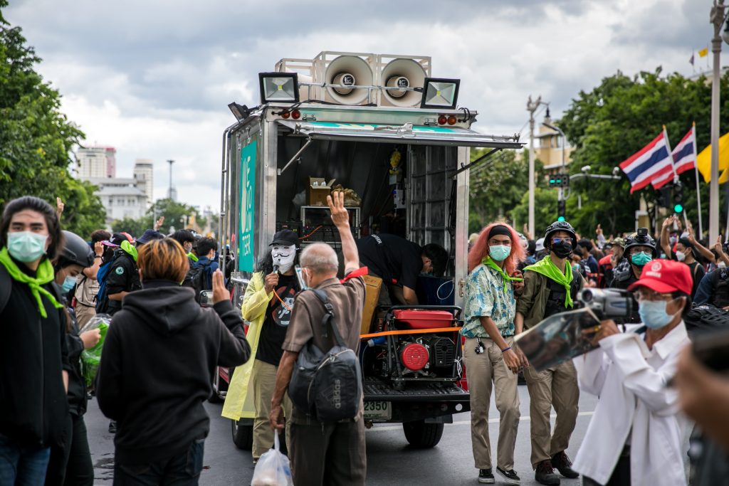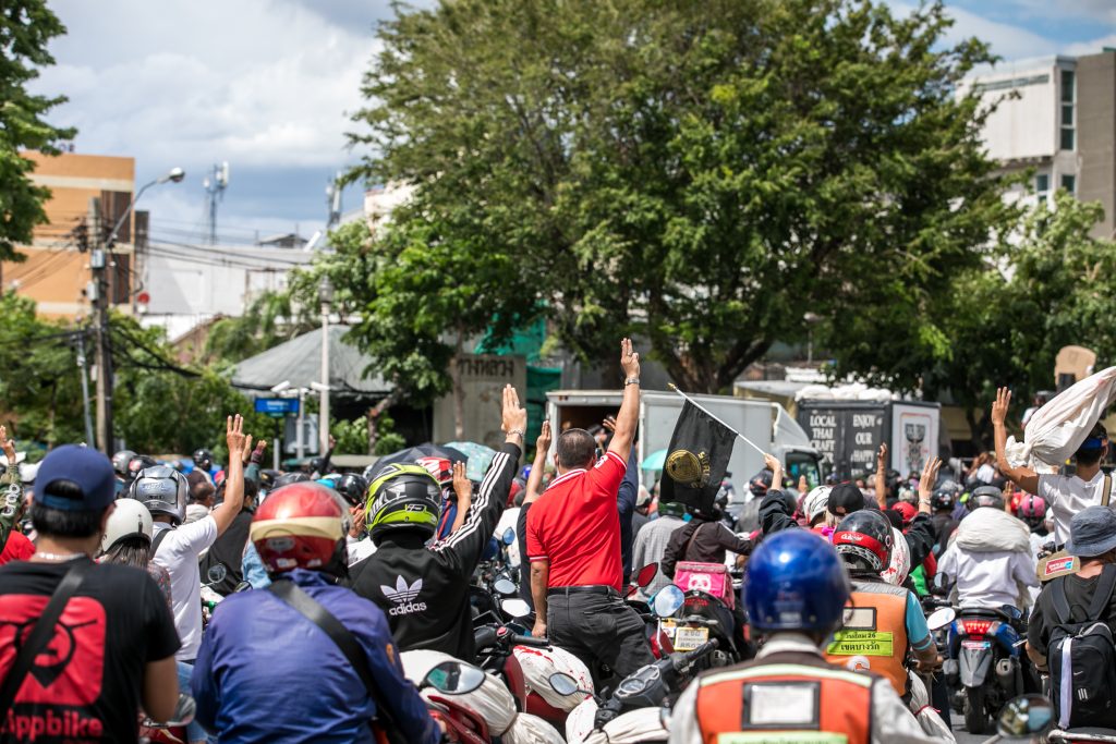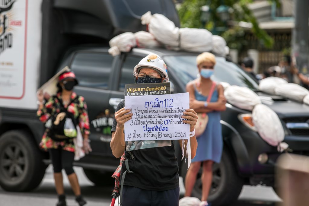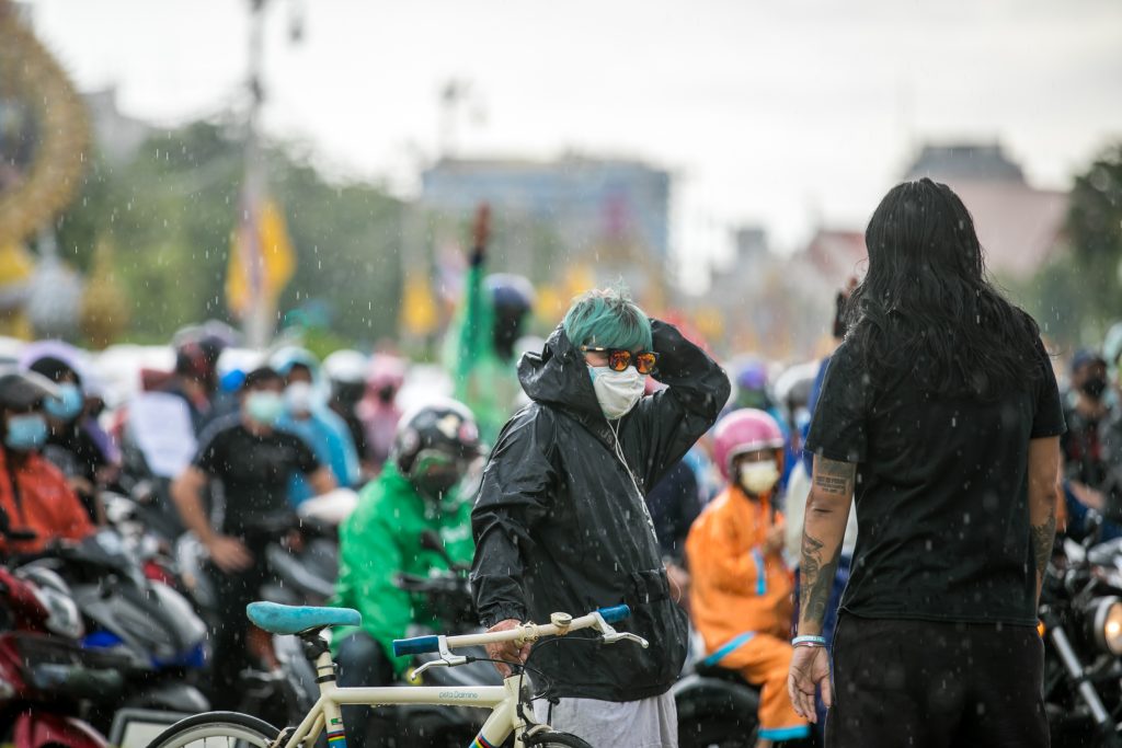 ภาพกิจกรรมการชุมนุมท่ามกลางการแพร่ระบาดของโควิด-19 นำโดยเยาวชนปลดแอก พร้อมกลุ่มแนวร่วมต่างๆ กับข้อเรียกร้อง 3 ข้อ คือ พล.อ.ประยุทธ์ จันทร์โอชา ต้องลาออกโดยไม่มีเงื่อนไข ปรับลดงบประมาณสถาบัน-กองทัพเพื่อนำมาใช้แก้ปัญหาโควิด และ หยุดซื้อวัคซีนด้อยคุณภาพที่เอื้อประโยชน์ต่อนายทุน แล้วไปจัดหาวัคซีนคุณภาพสูงมาฉีดให้กับประชาชนโดยเร็วที่สุด ผู้ชุมนุมตั้งขบวนบริเวณอนุสาวรีย์ประชาธิปไตย ก่อนมุ่งหน้าไปยังทำเนียบรัฐบาล โดยมีการแสดงออกในหลายรูปแบบ ทั้งป้ายข้อความต่างๆ หุ่นฟางที่ทำคล้ายศพเป็นสัญลักษณ์แทนผู้ที่เสียชีวิตจากโควิดจำนวนมากภายใต้การบริหารที่ล้มเหลวของรัฐบาล